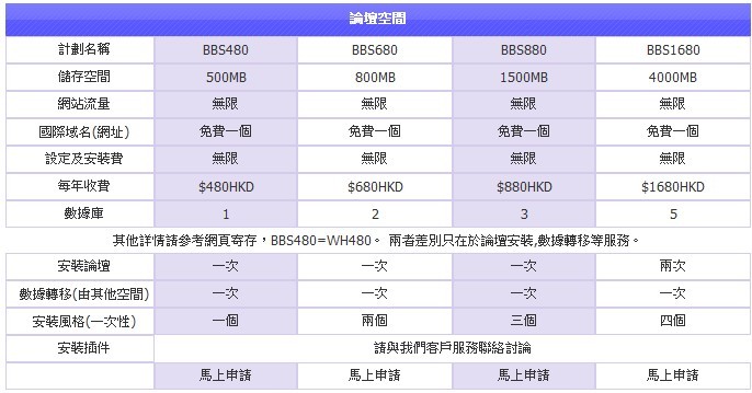 舊客戶不受任何影響,因為BBS與WH的容量, 空間, 權限是一樣的,例如BBS480可用500MB空間, WH480一樣是500MB空間,其他細節也是一樣的。